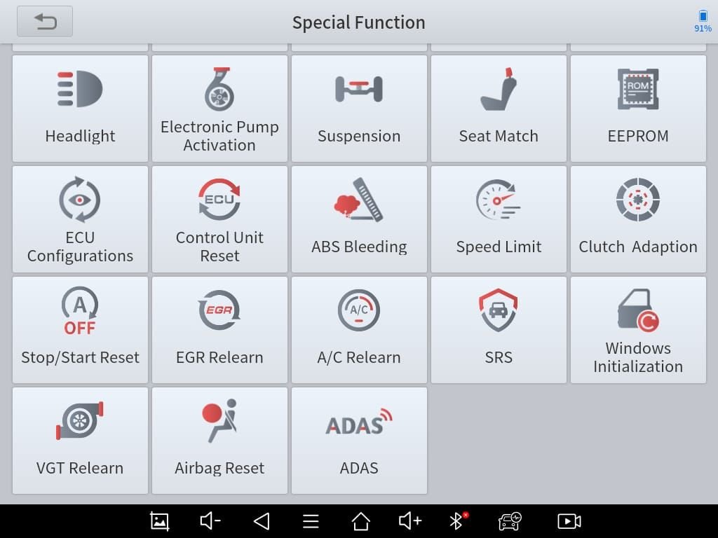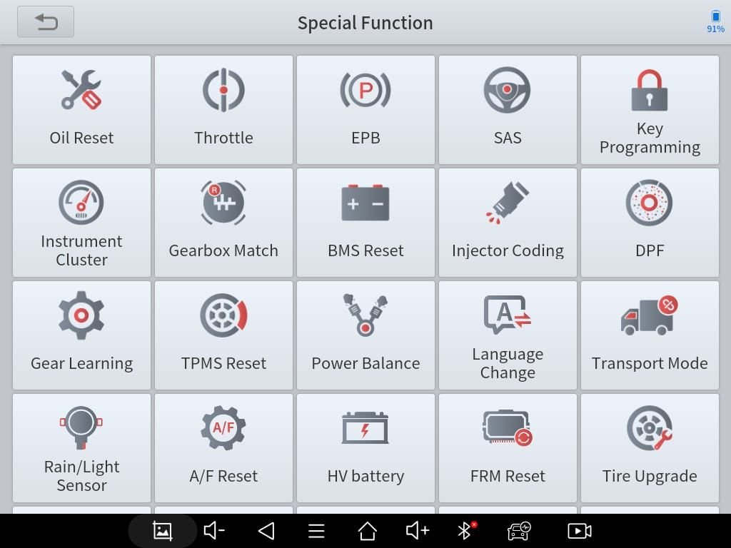 Capacidad avanzada de codificación ECU y codificación en línea + prueba activa (Control bidireccional). Admite todos los sistemas OE. Todos los diagnósticos de todas las funciones incluyen motor, Airbag, ECM, TCM, sistemas ABS, etc. Admite más de 31 funciones de servicio y reinicio como DPF, reinicio de aceite, EPB, SAS, IMMO y más